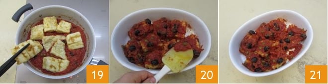 Add the cod to the sauce in the pan 19, let it simmer for a couple of minutes, then transfer the mixture into a baking dish 20, covering the cod with tomato, and finish cooking in a preheated oven at 320°F for 20 minutes. Take it out of the oven, garnish with chopped parsley, and your tray of Neapolitan-style cod is ready to be served! 21