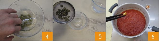 In the meantime, desalinate the capers by soaking them in a bowl with cold water 4 and then drain them 5 while waiting to add them to the pan. When the sauce is finished cooking, remove the garlic from the pan 6,