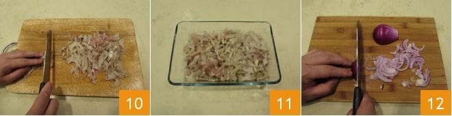 and cut the nervetti into thin strips 10, collect them in a glass container and let them cool for an hour 11. Thinly slice the onion, cleaned and with the core removed, i.e., the central part 12