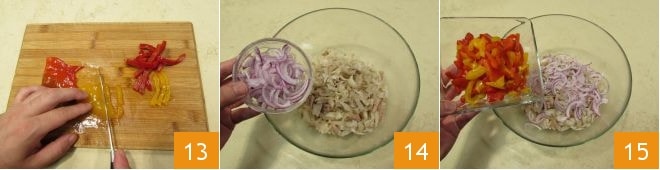 and then cut the pickled peppers into strips as well 13. At this point, take the nervetti and add them to the onions 14 and peppers 15.
