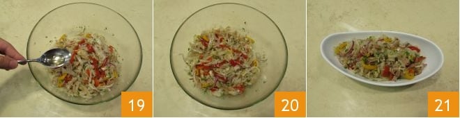 and add it to the salad along with the vinegar 19. Mix again 20 and at this point your nervetti salad is ready to be enjoyed 21.
