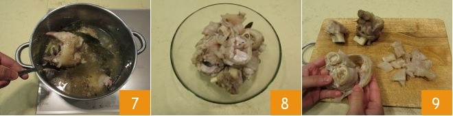 Cook on low heat for about two and a half hours, keeping the lid on the pot and once cooked, drain the parts 7, allowing them to cool in a container 8. Remove the meat from the bones with your hands 9