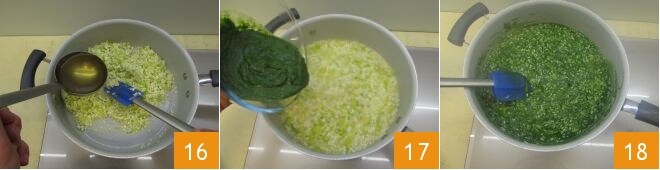 And only when all the alcohol has evaporated, add a couple of ladles of hot broth 16. Cook the risotto for about 5 minutes, then add the nettle cream 17, stir 18, and finish cooking the risotto by continuing to add more hot broth only as needed.