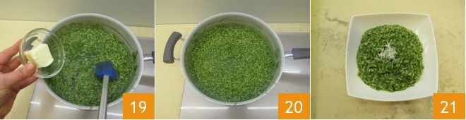Once the rice is cooked, turn off the heat, add the butter 19, and stir it in 20. At this point, plate your nettle risotto and serve it with grated Parmesan cheese 21.