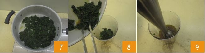 After about 10 minutes, the nettles will be ready 7, turn off the heat and transfer them into a tall glass 8 and blend them with an immersion blender 9,