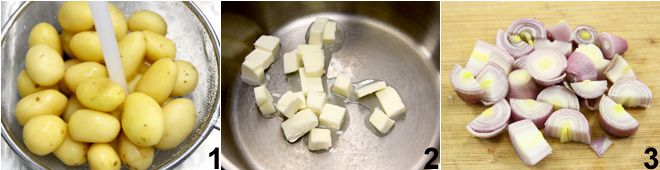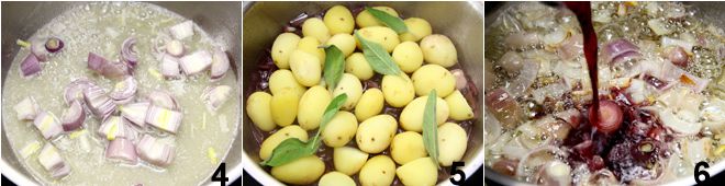 To prepare the new potatoes with red wine, start by washing the new potatoes well 1, and blanch them for a few minutes in a pot with salted boiling water until their inside is tender, then drain them well. Cut the larger ones in half. In a large pan, melt the butter over very low heat 2; in the meantime, chop the shallots into coarse pieces 3,