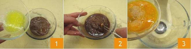To prepare Nutella brownies, first melt the butter in a small saucepan and heat the Nutella in a double boiler (or in the microwave for a few seconds). Combine the warm melted butter with the warm Nutella 1 and stir with a spatula to mix well 2: this way, you will obtain a smooth and lump-free cream. Let the butter and Nutella mixture cool slightly, in the meantime, pour the room temperature eggs into a stand mixer with a whisk attachment (alternatively, you can use an electric hand mixer) 3.