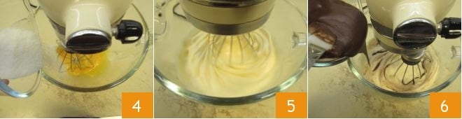 Set the mixer to medium speed, pour in the granulated sugar 4, and whisk until you get a light and fluffy mixture 5. Now, while the mixer is running, slowly pour in the cooled butter and Nutella mixture 6