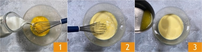 To prepare the sweet and savory crepes, start by gently melting the butter in a saucepan or in the microwave. Let it cool and in the meantime, break the eggs into a high-sided bowl. Mix with a whisk and add the milk 1. Continue mixing until you get a smooth mixture 2. Add now the warm butter 3 and mix again.