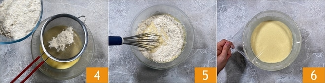 Place a sieve over the bowl and sift the flour into the bowl 4 (for convenience you can also add it in two stages and mix to avoid the formation of lumps). Then, with the whisk, mix vigorously to absorb the flour 5. Continue mixing until you get a smooth, velvety, and lump-free mixture. At this point, cover the bowl with plastic wrap 6 and let it rest for at least 30 minutes in the refrigerator.