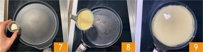 After the resting time, stir the batter to revive it, then heat a 9-inch crepe maker (or an alternative non-stick pan with the same base) and grease it with a knob of butter 7. Once at temperature, pour a ladle of batter sufficient to cover the surface of the pan 8: you can use the special crepe spreader or rotate the pan to distribute the batter evenly (be careful not to spread it all to the edges to avoid not having enough batter in the center to create a crepe with a uniform surface); it is advisable to perform these operations very quickly, as the batter will cook rapidly 9.