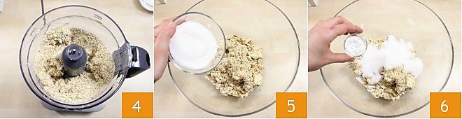 After grinding everything 4, when the butter is well distributed, remove the obtained mixture from the processor and place it in a large bowl. Now add the sugar 5, baking powder 6,