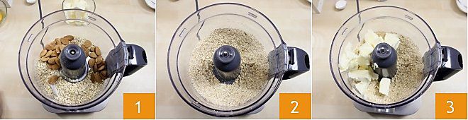 To prepare the oatmeal cookies, start by grinding half of the oats (5 oz) with the almonds 1. Once ground smoothly 2, add the softened butter 3.