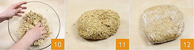 At this point, add the remaining oats (those not ground) and mix all the ingredients well with your hands 10. When you have obtained a homogeneous mixture 11, cover it with plastic wrap and let it rest in the refrigerator for 30 minutes 12.