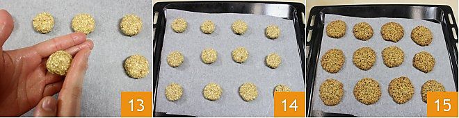 When the dough has reached the right consistency (it should be quite firm), divide it into many small parts, each weighing 0.5 oz. With wet hands, make many small balls 13 and place them on a baking tray lined with parchment paper, ensuring there is enough space between each ball as they will spread and expand during baking 14. Bake at 350°F for 20 minutes (if using a fan oven, 320°F for about 15 minutes), then remove the oatmeal cookies from the oven as soon as they are golden brown 15. Your oatmeal cookies are ready!