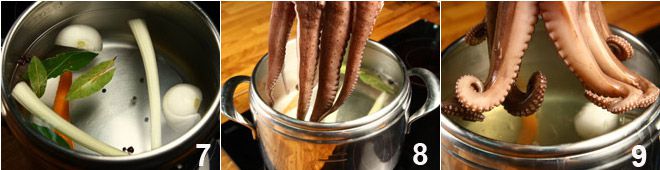 Fill a large pot with water up to 3/4, add the peeled carrot, the halved onion, the celery stalks, bay leaves, juniper berries, peppercorns, and salt 7. Bring everything to a boil, then dip and remove the tips of the octopus tentacles into the boiling liquid 4-5 times so they curl up nicely (8-9), making them more visually appealing: