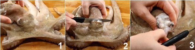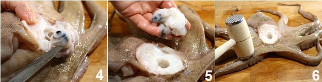 and remove the eyes and beak (4-5); also, empty the inside of the sac, and if you are dealing with a larger octopus, tenderize the meat by gently pounding it with a meat mallet 6.