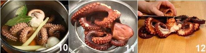 Then, completely immerse the octopus in the boiling liquid 10 and let it cook for about 70 minutes. The octopus should be cooked but still firm, so check its doneness by inserting a fork into the flesh. When the octopus is cooked, remove it from the cooking liquid, drain it 11, and cut it into 4-5 pieces (12-13).