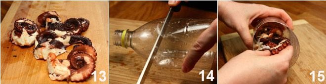 Then prepare the plastic bottle 14 which you will use to shape the octopus meat into a cylinder: cut off the top and insert the octopus in a harmonious way 15, as once pressed they will form a pattern on the slices you will cut.