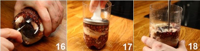 Then puncture the bottom with a pointed pair of scissors 16, a step that will help release excess liquid while you press the octopus into the bottle that you have placed on a plate; using a well-cleaned glass bottle (or anything else that can help you push, like a pestle or meat mallet) slightly smaller than the plastic one, press the octopus meat downwards 17; as you will notice, a lot of cooking liquid will come out from the holes at the bottom of the bottle. With scissors, cut the ends of the bottle to form tabs 18