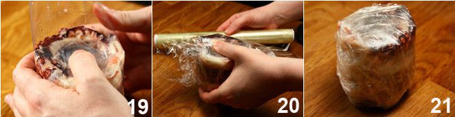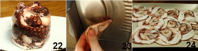 Once pressed, place the octopus in the coldest part of the refrigerator for at least 24 hours, then, when ready to serve, cut the plastic bottle 22, extract the octopus in a single cylindrical block, and slice it finely with a knife or, better yet, with a slicer (23-24), as if it were a salami.