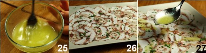 Then prepare the citronette which will be used to flavor the octopus by emulsifying lemon juice, olive oil, and a pinch of salt 25. Arrange the slices of octopus on a serving platter, sprinkle them with chopped parsley 26, garlic, and season with the citronette 27. Garnish the octopus carpaccio with lemon slices (or wedges) and parsley sprigs.