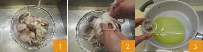 To prepare the drowned baby octopuses, start with the baby octopuses: if you have already cleaned baby octopuses, rinse them well under running water (1-2). Otherwise, you can follow our guide on How to Clean and Cook Octopus. Once the baby octopuses are ready to be cooked, place the peeled garlic in a large pan, along with the oil and dried chili pepper 3.