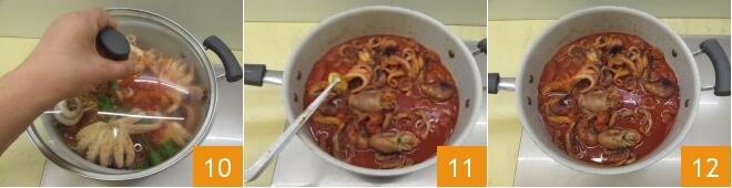 Cover the pot with a lid 10, and let it cook on low heat for 30-40 minutes, depending on the size of the baby octopuses. To check if they are cooked, pierce them with a fork: if they are tender, they are perfectly cooked. Remove the garlic with kitchen tongs 11; the drowned baby octopuses are ready to be served 12!