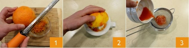To prepare the olive oil plumcake, start by grating the orange zest 1, then squeeze out 3.4 oz of juice and filter it with a sieve (2-3).