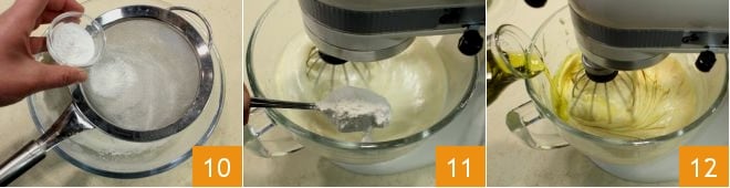 In a bowl, pour in 2 1/2 cups of sifted flour along with the baking powder 10; add it to the stand mixer a little at a time 11 and when it is incorporated, slowly drizzle in the oil in 4 batches 12.