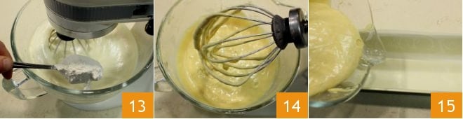 Continue mixing and gradually add the remaining 7/8 cup of flour 13; when the mixture is homogeneous and foamy 14, transfer it to a greased and parchment-lined 12x4 inch loaf pan 15