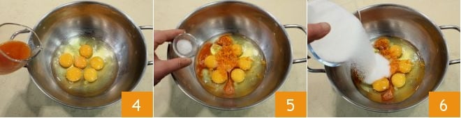 In a mixing bowl (or in a large aluminum bowl or pot), pour in the whole eggs and the orange juice 4, then the zest and a pinch of salt 5. Add the sugar as well 6