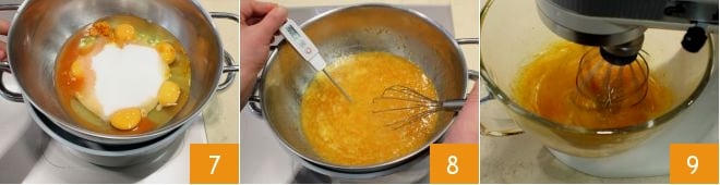and place the mixing bowl on a large pot filled with water 7: the water in the pot should not touch the bottom of the mixing bowl. Turn on medium heat and start mixing the ingredients with a whisk. The temperature should not exceed 104°F: you can measure the temperature with a food thermometer 8. Once 104°F is reached, pour the mixture into a stand mixer 9 (or use a bowl and an electric mixer), attach the whisk, and start working the mixture for at least 15 minutes.