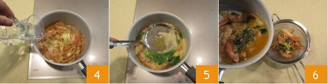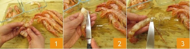 To prepare the one-pot quinoa, start by checking the instructions on the quinoa package: if it needs rinsing, rinse it under running water and then dry it on a tea towel, patting it to remove excess water. Then proceed with the How to clean shrimp. Use your hands to detach the head, then pull off the legs and remove the shell, leaving the tail intact 1. With a small knife, cut along the back of each shrimp 2 and remove the intestine using the tip of the knife 3. Store the cleaned shrimp in the refrigerator and use the scraps to make the Shellfish Stock.