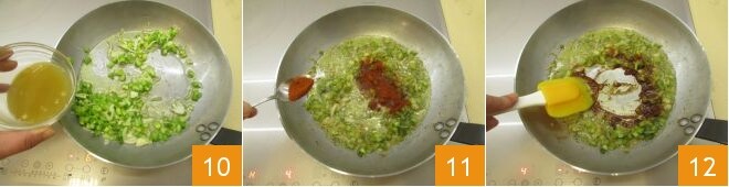 At this point, add a ladleful of bisque (about 50 g will be sufficient) 10, stir and wait another ten minutes until they are well wilted. Add the paprika 11 and stir to combine the ingredients 12.