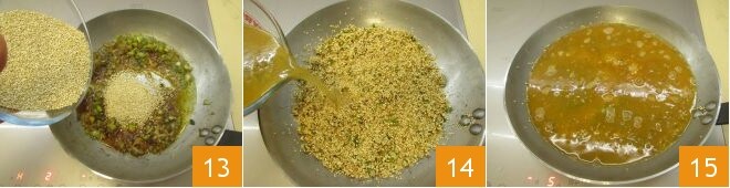 Add the quinoa 13, stir and wait 1-2 minutes until it is slightly toasted. Then add the hot shellfish bisque 14, until the quinoa is entirely covered 15.