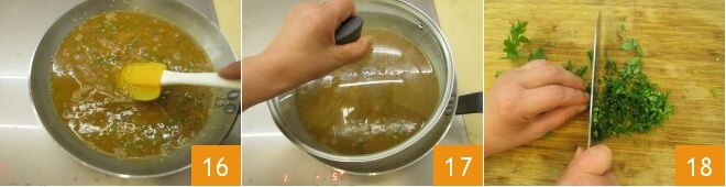 Stir with a spatula 16 and cover with a lid 17. Let it cook like this for about 17 minutes over very low heat without lifting the lid or stirring. Meanwhile, prepare the seasoning for the shrimp: finely chop the parsley 18.