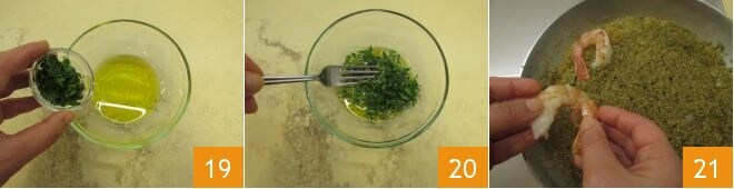 and pour it into a small bowl where you have already added the oil 19. Stir with a fork 20 and set aside. After 17 minutes, remove the lid and without stirring the quinoa, lay the shrimp on top 21.