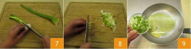 Keep the bisque warm and in the meantime, prepare the soffritto for the quinoa. Remove the outer strings of the celery and the end of the scallion. Then cut it in half 7 and finely chop both 8. Pour the oil into a pan, add the celery and scallion 9, and sauté for about 5 minutes over low heat.