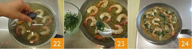 Cover again with the lid 22 and cook for another 3 minutes. At this point, remove the lid, turn off the heat, and season the shrimp with the parsley oil just prepared 23. The one-pot quinoa is ready to serve 24!
