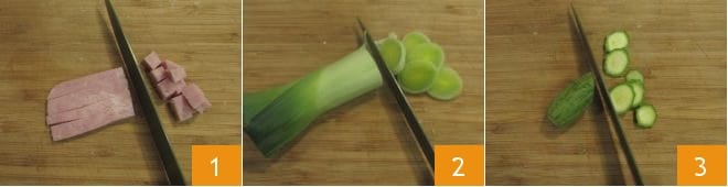 To make the one-pot rice, first prepare a light Vegetable broth and keep it warm. Cube the cooked ham 1. Remove the outer leaves of the leek, eliminate the base, and slice it thinly 2. Wash, trim, and slice the zucchini into rounds 3.