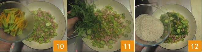 the zucchini flowers 10, and the arugula, previously washed and dried 11. Finally, add the rice 12.