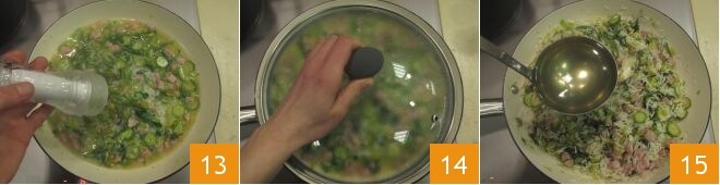 Cover the rice with broth, salt 13, pepper, and cook over low heat with the lid on for about 10 minutes 14. Once the broth is absorbed, uncover, add more broth 15, and cook for another 10 minutes over low heat.