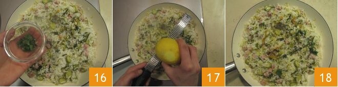 Once the rice is cooked, flavor the dish with coarsely chopped mint leaves 16 and grated lemon zest 17. Serve the one-pot rice directly in the pan 18!