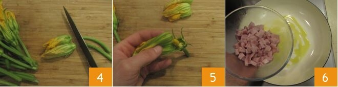 Clean the zucchini flowers by removing the stem 4 and the internal pistil 5: you will get about 80g (2.8 oz). In a large pan, pour a drizzle of oil and sauté the ham cubes 6.