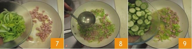 Add the leek 7, let it brown, and then cook for about 2 minutes with half a ladle of vegetable broth 8. Add the zucchini 9,