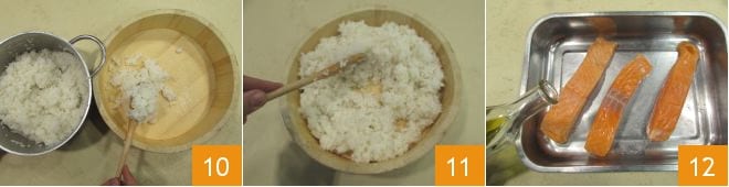 Transfer the rice to the hangiri, the special wooden bowl 10, and gently mix with the wooden paddle to cool the rice 11: the rice should not cool completely. Move on to preparing the fish for the filling: season the salmon with oil 12, salt, and pepper, turning the fillets on all sides to ensure they are evenly flavored.