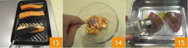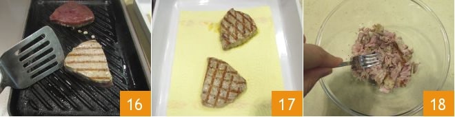 grill them for 3 minutes on each side 16, gently dry them on paper towels 17, then break the tuna into pieces in a bowl using the tines of a fork 18.