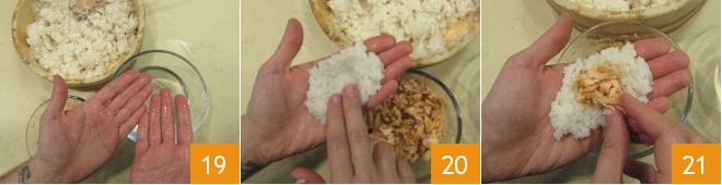 At this point, you can start assembling the onigiri: wet your hands in a bowl full of water, to better handle the rice 19, then rub your palms with some salt to flavor the rice while forming the rice balls. Take a handful of rice and flatten it in the palm of one hand 20; add a generous spoonful of salmon or tuna pieces 21