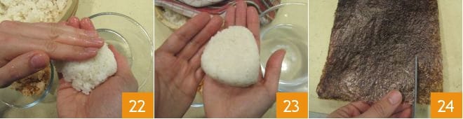 and cover with another portion of rice 22, then shape the rice between your hands into a triangle shape 23. Keep in mind that each triangle will require about 100 g of rice, and with these quantities, you will obtain about 10 onigiri. Now take the sheet of nori seaweed and cut it into strips about 2 cm wide 24
